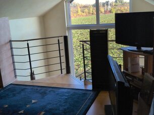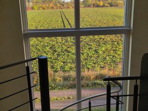 Über die geschlossene, breite Wendeltreppe, mit unverbaubarem Ausblick auf Felder durch ein großes Panoramafenster, betritt man den offenen Wohnbereich, dieser bietet ebenfalls einen traumhaften Ausblick in die Natur. Gemütliche Abende auf der Couch sind hier vorprogrammiert. Abgerundet wird die obere Etage durch ein separates Schlafzimmer.