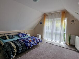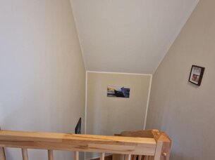 Vom Flur aus führt die offene Holztreppe in das Obergeschoss, hier befinden sich das geräumige Schlafzimmer, mit großer, bodentiefer Fensterfront, ein Kinderzimmer mit Doppelfenster und genug Platz zum Spielen für Ihre Kinder. Abgerundet wird diese Etage durch ein weiteres, kleines Tagelichtbadezimmer mit Toilette und Waschbecken, welches auch als Gäste-WC genutzt werden kann. Im oberen Bereich sind Heizkörper verbaut. Erd,- und Obergeschoss sind mit Rollläden ausgestattet.