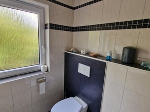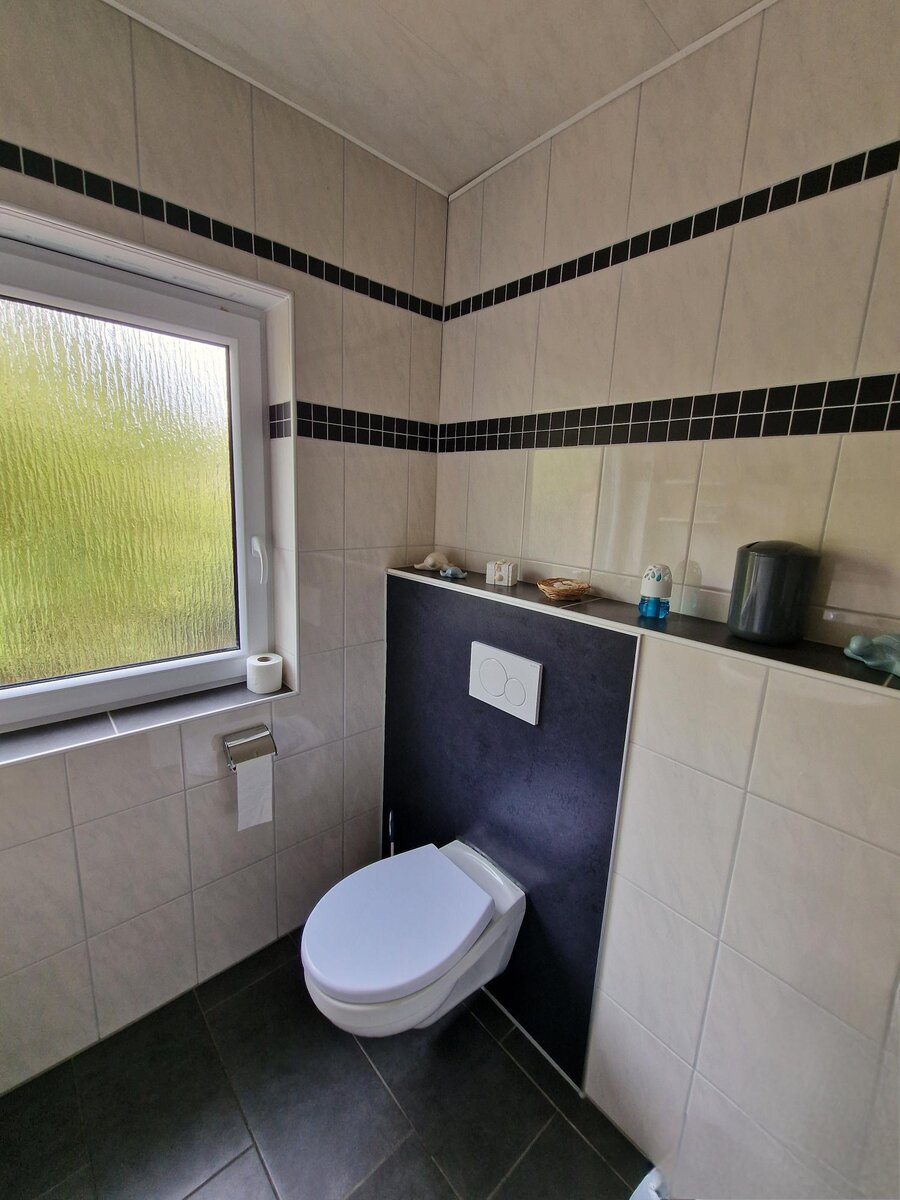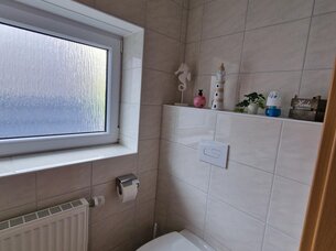 Vom Flur aus führt die offene Holztreppe in das Obergeschoss, hier befinden sich das geräumige Schlafzimmer, mit großer, bodentiefer Fensterfront, ein Kinderzimmer mit Doppelfenster und genug Platz zum Spielen für Ihre Kinder. Abgerundet wird diese Etage durch ein weiteres, kleines Tagelichtbadezimmer mit Toilette und Waschbecken, welches auch als Gäste-WC genutzt werden kann. Im oberen Bereich sind Heizkörper verbaut. Erd,- und Obergeschoss sind mit Rollläden ausgestattet.