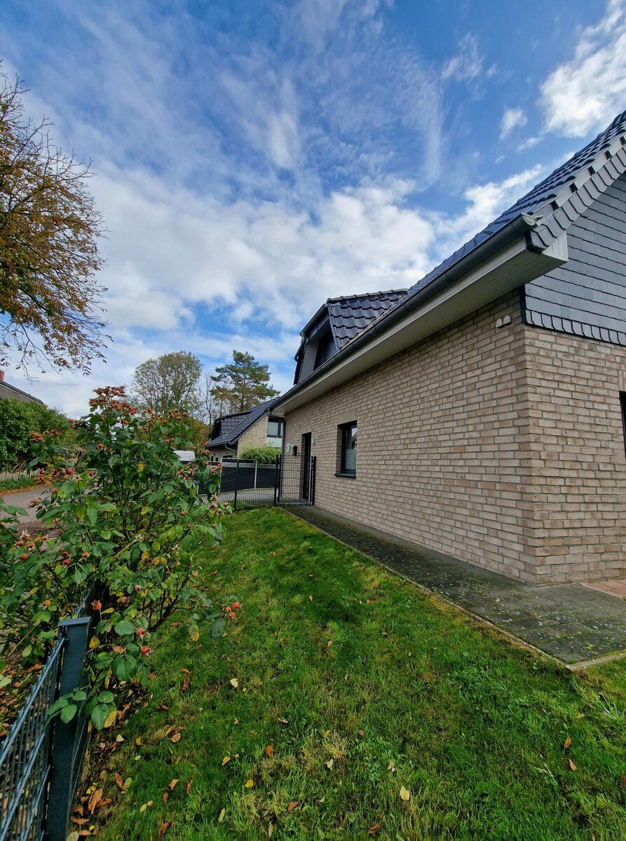 Der gesamte Garten ist mit einem farblich, auf das Haus abgestimmten, Doppelstabmattenzaun versehen. Jedes Haus verfügt über eine große Terrasse, die im Anschluss an den Nachmittag am Meer noch zum Grillen und Abend ausklingen lassen, einlädt. Durch die versetzte Bauweise ist die Privatsphäre auf der Terrasse gewährt ebenso beim Hauseingang, was diese Schmuckstücke noch begehrter macht. Die große Auffahrt bietet Platz für 4 Fahrzeuge.